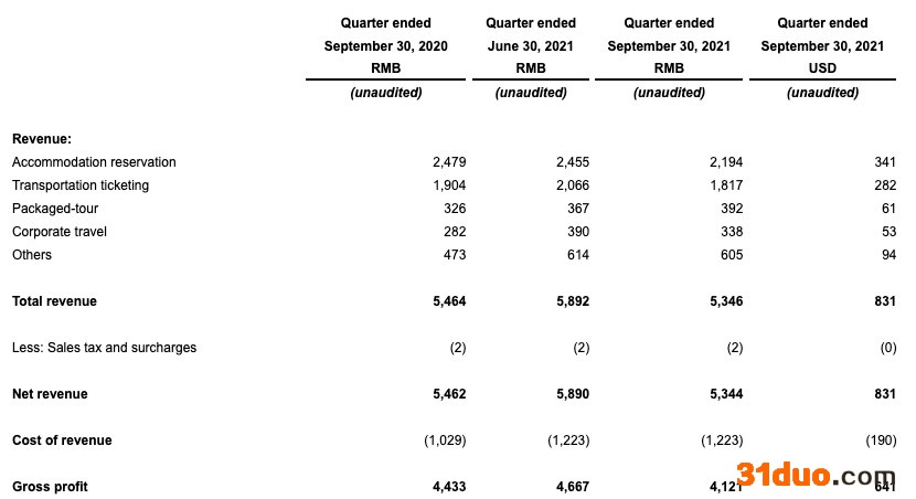 收入方面,携程三季度净营收为53亿元,同比下降2%,环比下降9%,主要源于中国某些地区再次出现新冠肺炎病例。其中,住宿预订业务营收为22亿元,同比下降11%,环比下降11%;交通票务业务营收为18亿元(约合2.82亿美元),同比下降5%,环比西下降12%;旅游度假业务营收为3.92亿元(约合6100万美元),同比增长20%,环比增长7%;商旅管理业务营收为3.38亿元,同比增长20%,环比下降13%。