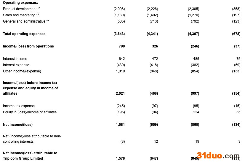 利润方面,三季度归属于携程股东的净亏损为8.49亿元,上年同期录得净利润16亿元,上季度净亏损6.47亿元,净亏损环比扩大31.22%;按非美国通用会计准则(Non-GAAP),剔除股权激励支出和记录在其它收入/支出中的权益性证券投资和可交换优先票据的公允价值变化,归属于携程股东的净利润为5.23亿元,较上年同期的14亿元下降63%,较上季度的7.28亿元下降28%。