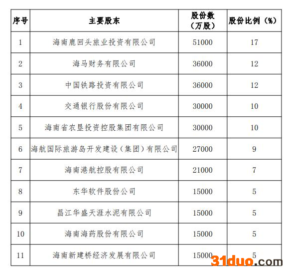 海南银行总股本30亿股,注册资本30亿元人民币,由海南鹿回头旅业投资有限公司(海南省发展控股有限公司全资子公司)作为主发起人,交通银行作为战略投资者,共12家股东共计出资40.8亿元发起设立。