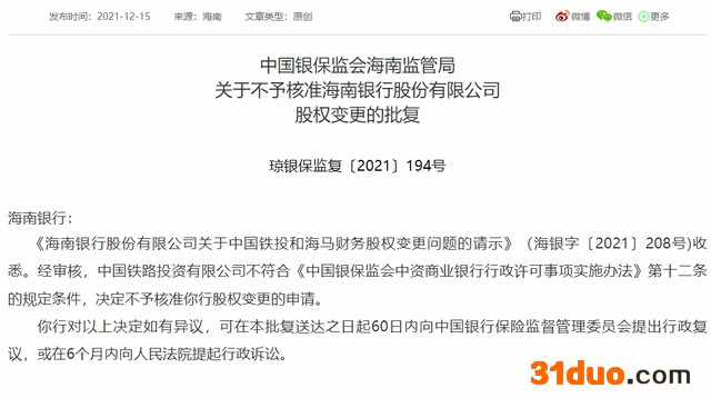 12月15日,中国银保监会海南监管局发布了行政许可批复,表示中国铁投由于不符合《中国银保监会中资商业银行行政许可事项实施办法》(以下简称《办法》)第十二条的规定条件,决定不予核准海南银行股权变更的申请。