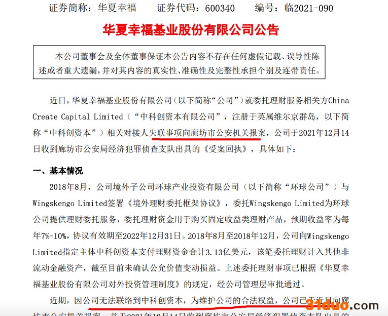 公告显示,2018年8月,公司境外子公司环球产业投资有限公司(以下简称“环球公司”)与Wingskengo Limited签署《境外理财委托框架协议》,委托Wingskengo Limited为环球公司提供理财委托服务,委托理财资金用于购买固定收益类理财产品,预期收益率为每年7%-10%,协议有效期至2022年12月31日。2018年8月至2018年12月,公司向WingskengoLimited指定主体中科创资本支付理财资金合计3.13亿美元,该笔委托理财计入其他非流动金融资产,截至目前未确认公允价值变动损益。上述委托理财事项已根据《华夏幸福基业股份有限公司对外投资管理制度》的规定,经公司管理层审批通过。近期,因公司无法联络到中科创资本,为维护公司的合法权益,公司已于近日向廊坊市公安机关报案,并于2021年12月14日收到廊坊市公安局经济犯罪侦查支队出具的《受案回执》。