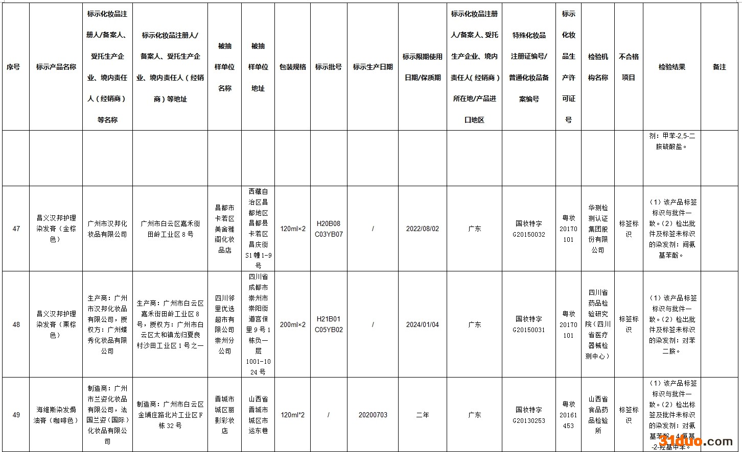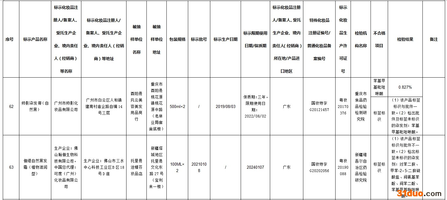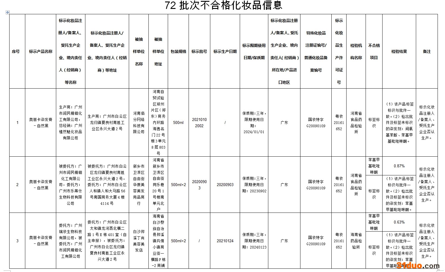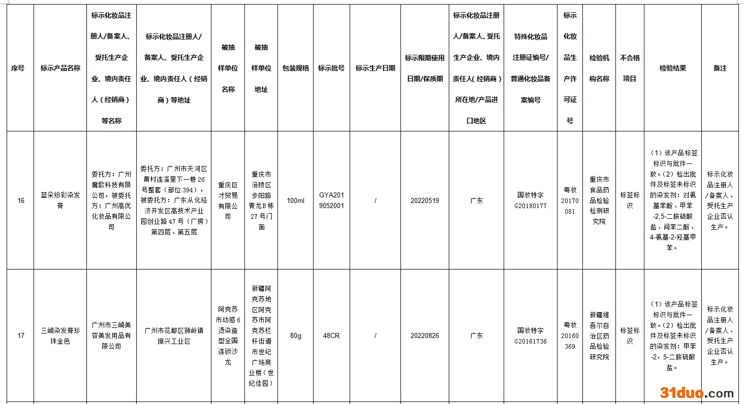 中新经纬12月16日电 据国家药监局网站消息,在2021年国家化妆品监督抽检工作中,经河南省食品药品检验所等单位检验,标示为广州市润民精细化工有限公司生产的奥丽卡染发膏-自然黑等72批次化妆品不合格。