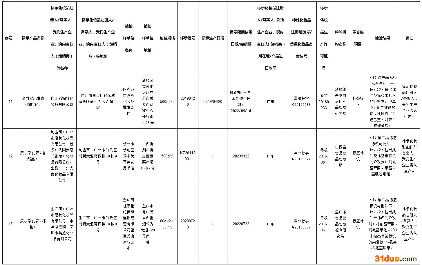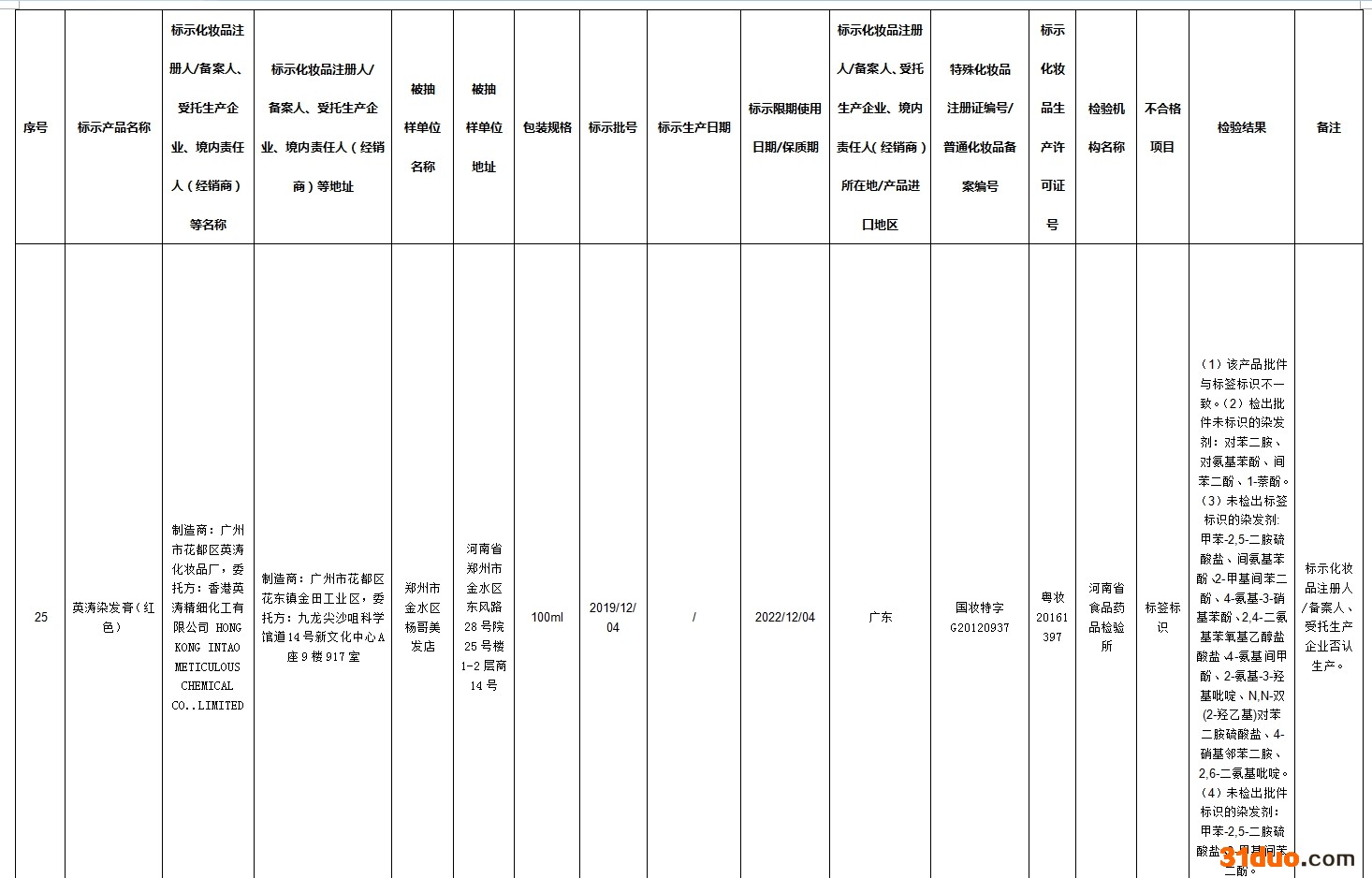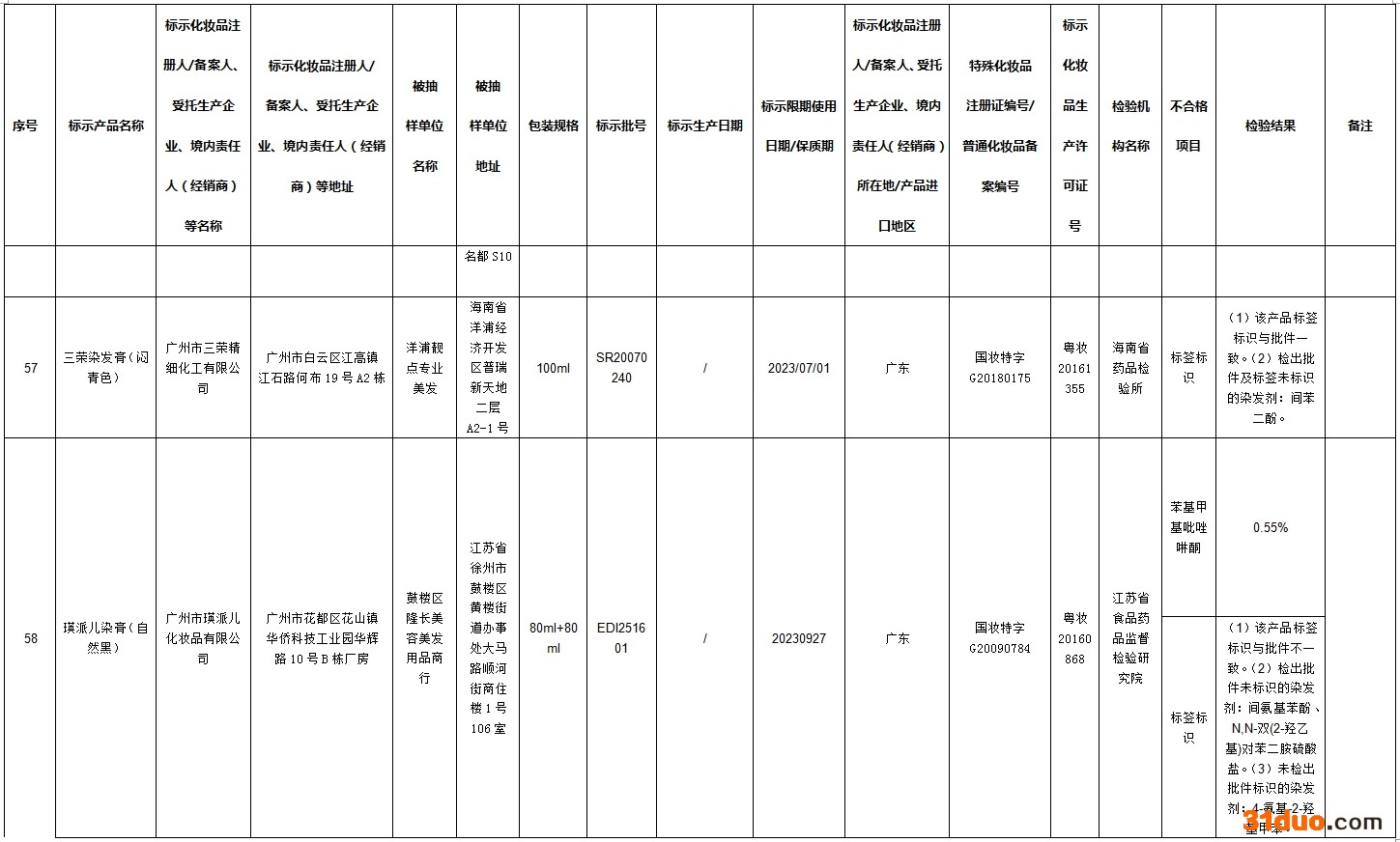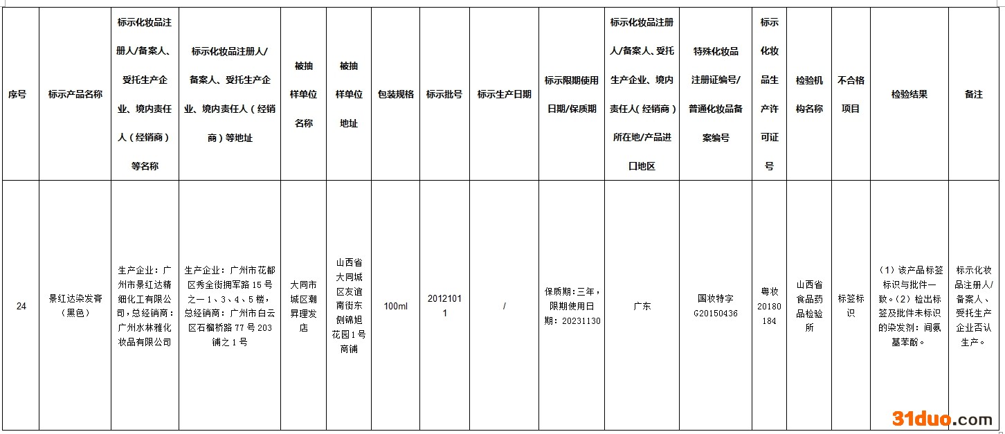中新经纬12月16日电 据国家药监局网站消息,在2021年国家化妆品监督抽检工作中,经河南省食品药品检验所等单位检验,标示为广州市润民精细化工有限公司生产的奥丽卡染发膏-自然黑等72批次化妆品不合格。