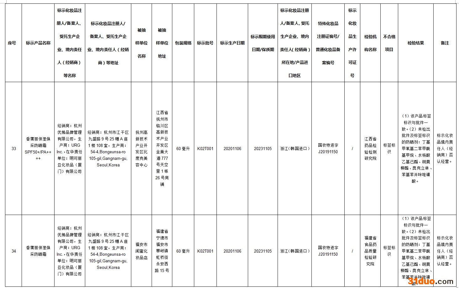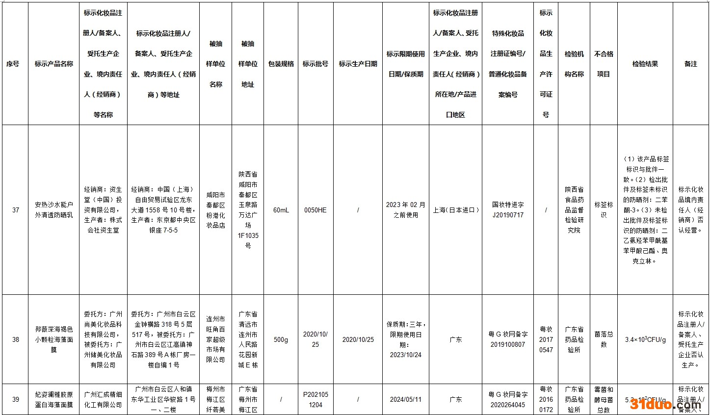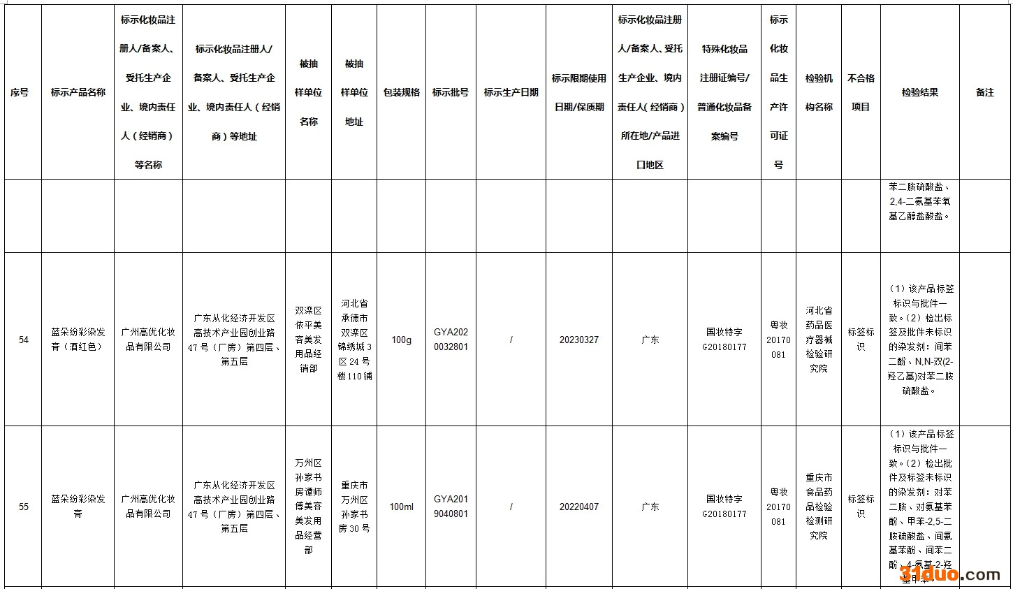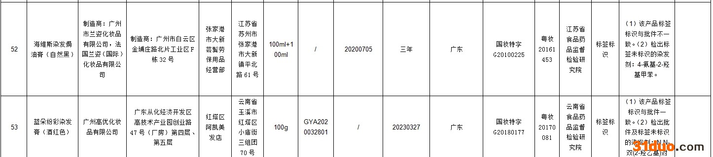 其中42批次不合格产品标签上标示的化妆品注册人、备案人、受托生产企业、境内责任人(经销商)否认生产或者进口过上述产品;2批次不合格产品标签上标示的受托生产企业否认生产过上述产品。