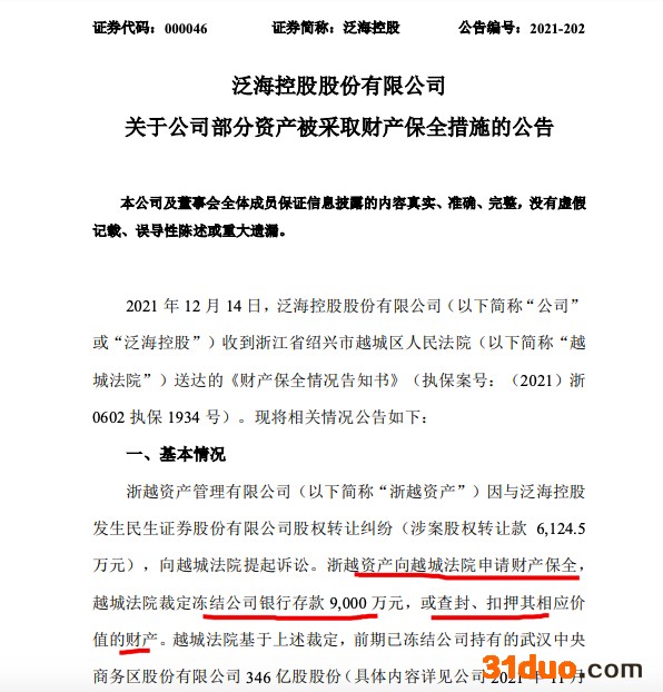 公告显示,浙越资产向越城法院申请财产保全,越城法院裁定冻结公司银行存款9000万元,或查封、扣押其相应价值的财产。越城法院基于上述裁定,前期已冻结公司持有的武汉中央商务区股份有限公司346亿股股份。越城法院另冻结了公司部分银行账户,冻结资金323,645.84元;冻结了公司持有的泛海不动产投资管理有限公司100%股权、泛海股权投资管理有限公司100%股权、民生金服控股有限公司100%股权、泛海电力控股有限公司100%股权,冻结期限36个月;轮候冻结了公司持有的民生证券股份有限公司股权;查封了公司名下部分房产,查封期限36个月。