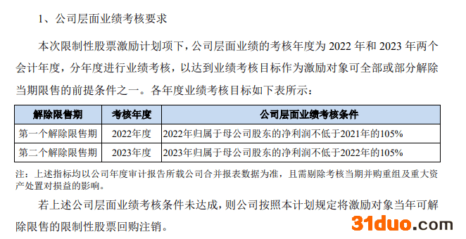本次限制性股票激励计划项下,公司层面业绩的业绩考核条件为2022年归母净利润不低于2021年的105%;2023年归母净利润不低于2022年的105%。