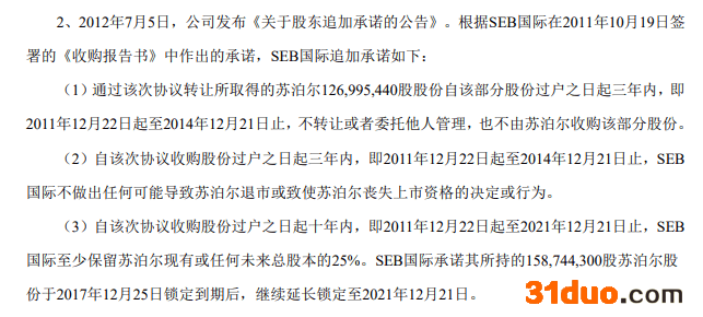 据苏泊尔2015年公告,2011年12月22日起至2021年12月21日止,SEB国际至少保留苏泊尔现有或任何未来总股本的25%。SEB国际承诺其所持的1.59亿股苏泊尔股份于2017年12月25日锁定到期后,继续延长锁定至2021年12月21日。