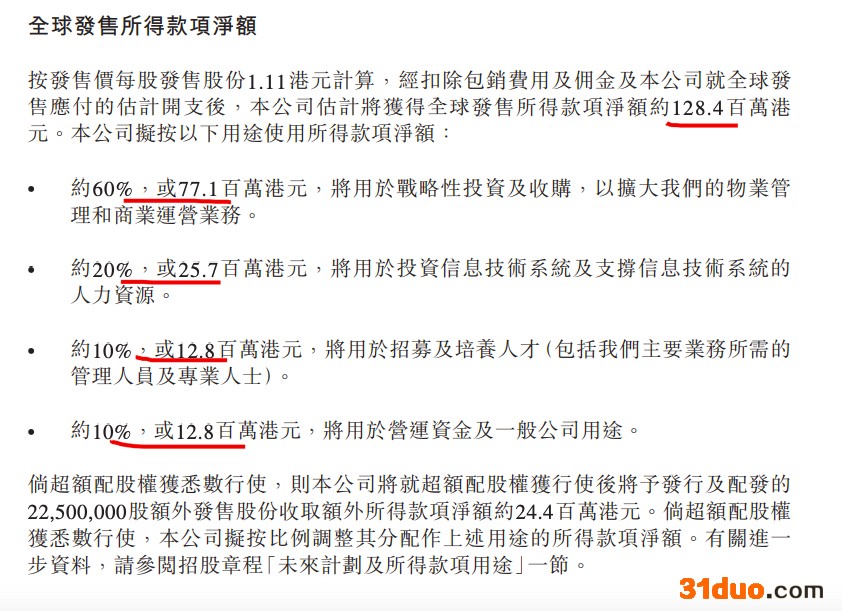 公告指出,募集资金的约60%即7710万港元将用于战略性投资及收购,以扩大物业管理和商业运营业务;约20%即2570万港元将用于投资信息技术系统及支撑信息技术系统的人力资源;约10%即1280万港元将用于招募及培养人才(包括主要业务所需的管理人员及专业人士);约10%即1280万港元将用于营运资金及一般公司用途。