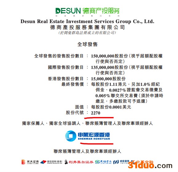中华网财经12月16日讯:德商产投服务集团有限公司(简称:德商产投服务,2270.HK)披露全球发售的发售价及配发结果显示,德商产投服务将发售价定为每股发售股份1.11港元(不包括1%经纪佣金、0.0027%证监会交易征费及0.005%联交所交易费)。