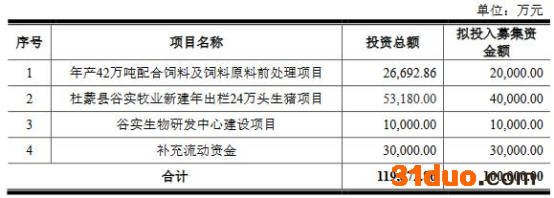 谷实生物原拟公开发行股票数量不超过3666.6667万股,且发行股票数量占公司发行后总股本的比例不低于25%。谷实生物原拟募集资金10.00亿元,计划分别用于年产42万吨配合饲料及饲料原料前处理项目、杜蒙县谷实牧业新建年出栏24万头生猪项目、谷实生物研发中心建设项目、补充流动资金。