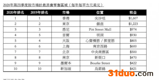 今年4月,戴德梁行发布的报告显示,香港尖沙咀首度取代铜锣湾成为亚太区零售租金最贵的地段,紧随其后的则是东京银座、悉尼Pitt Street Mall。