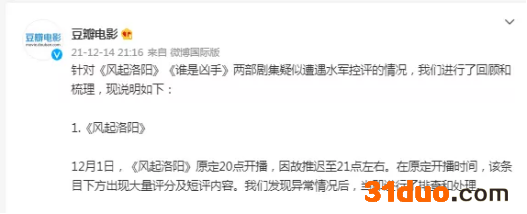 针对《风起洛阳》《谁是凶手》两部剧集疑似遭遇水军控评的情况,我们进行了回顾和梳理,现说明如下:
