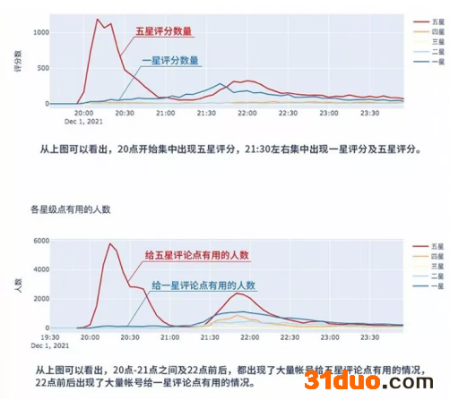 21点~22点,剧集开播,条目下出现非正常评分3956条,其中五星评分1687条,给五星评论点有用93,466次,涉及帐号5662个;一星评分1991条,给一星评论点有用85,690次,涉及帐号3667个;