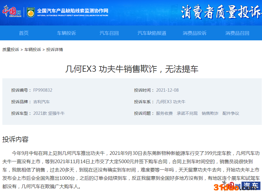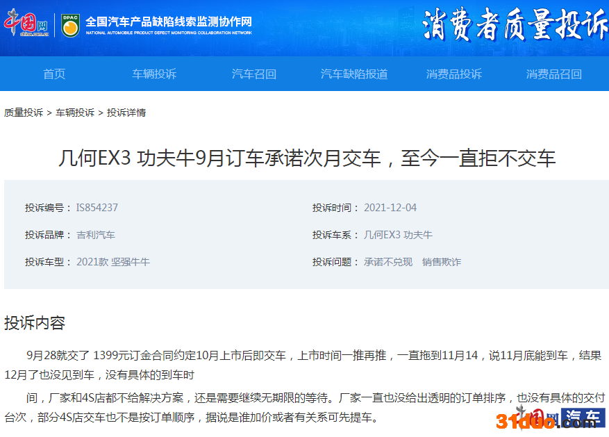 与此同时,记者也在其他网络平台中发现,近期也有大批吉利几何EX3功夫牛车主发起了相同的投诉,大部分车主称:早在今年9月新车预售时就已支付定金,然而交付车辆却一拖再拖。此外,投诉车主表示:“几何EX3功夫牛的销售过程极其不透明,几何汽车严重损害了消费者的知情权。”