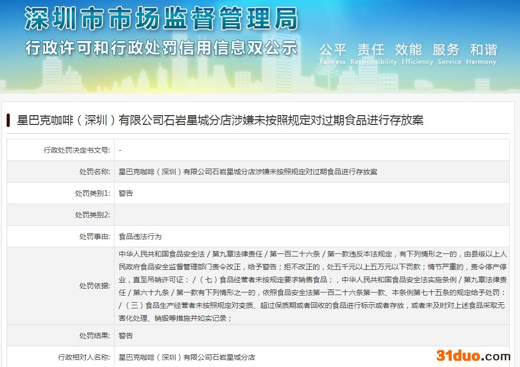 中新经纬12月16日电 从深圳市市场监管局获悉,近日,星巴克咖啡(深圳)有限公司石岩星城分店涉嫌未按照规定对过期食品进行存放,被深圳市市场监督管理局警告。