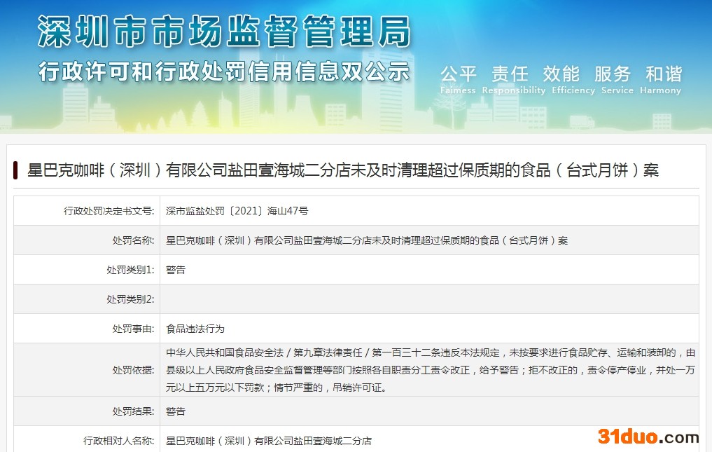 值得注意的是,此前,该公司盐田壹海城二分店曾因未及时清理超过保质期的月饼被警告。