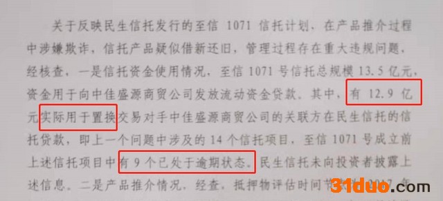 同时,意见书明确了“至信1071号”13.5亿元的总规模中,有12.9亿元实际用于置换交易对手的关联方上述的14个信托贷款,更恶劣的是,在“至信1071号”成立前就已有9个处于逾期状态,而民生信托同样未向投资者披露上述信息,明目张胆地进行着借新还旧、掩盖不良的违规操作。