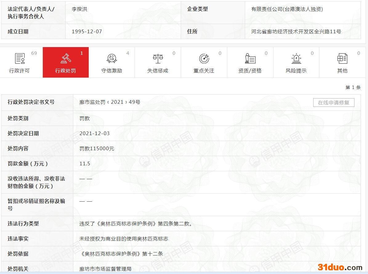 中新经纬12月16日电 据信用中国网站消息,好丽友食品有限公司新增一则行政处罚信息,因其未经授权为商业目的使用奥林匹克标志被廊坊市市场监管局罚款11.5万元,处罚决定日期为12月3日。