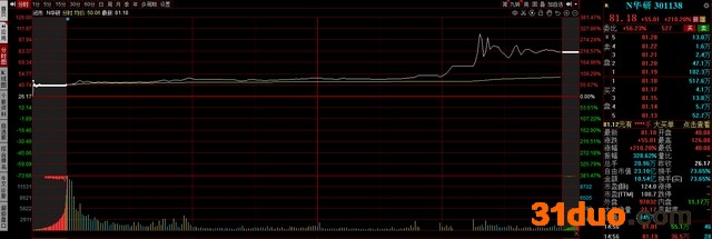 华研精机发行价26.17元,以40元开盘,较发行价涨幅52.85%,虽然华研精机的开盘表现相比于注册制实施以来上市首日开盘涨幅动辄超过100%、200%的新股而言并不出众,但早上公司股价一直维持在分时均线上方,下午13:40左右开始拉升,在13:48股价来到52元,日内实际涨幅达30%,触及第一次临停,13:58股票复牌后迅速推升至64元,日内实际涨幅扩大到60%,触发第二次临停,再度复牌后引发资金进一步哄抢,最高价达到126元,日内实际涨幅最高超过300%,最终华研精机报收81.18元,较发行价收涨210.2%,首日实际涨幅102.95%,也就是说今天开盘买进的投资者到收盘已浮盈一倍,而打新华研精机到收盘每签可浮盈2.75万元。