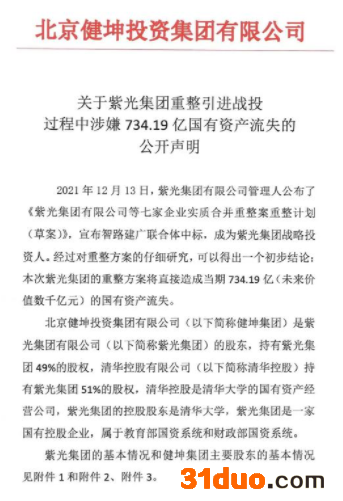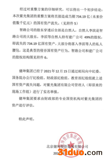 蓝鲸TMT频道12月15日讯,北京健坤投资集团有限公司(以下简称“健坤集团”)的一份声明文件显示,紫光集团有限公司(以下简称“紫光集团”)的重整方案将直接造成当期734.19亿元的国有资产流失,并已向中纪委等多部门实名举报。