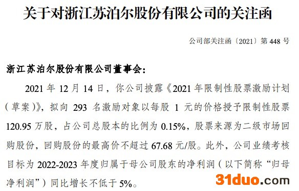 中华网财经讯,12月15日,深交所向苏泊尔下发关注函,要求苏泊尔说明以不超过67.68元/股进行回购再以1元/股作为授予价格的依据及合理性,同时说明是否存在向被激励对象进行利益输送的情形。