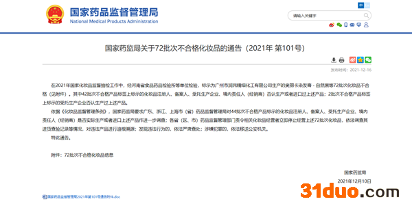 中国网财经12月16日讯 今日,国家药监局发布关于72批次不合格化妆品的通告(2021年 第101号)。