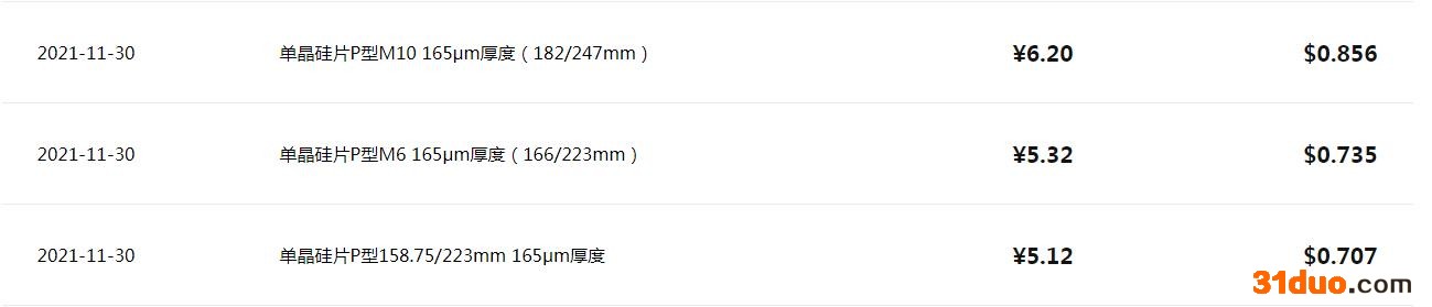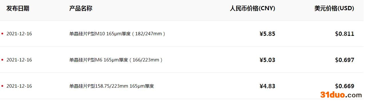 16日,隆基官网报价显示,单晶硅片P型M10 165μm厚度(182/247mm)价格下调至5.85元,单晶硅片P型M6 165μm厚度(166/223mm)下调至5.03元,单晶硅片P型158.75/223mm 165μm厚度下调至4.83元。