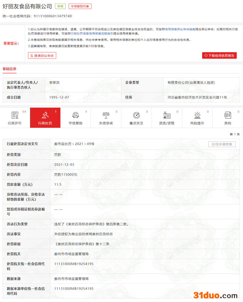中国网财经12月16日讯 据信用中国网站消息,近日,好丽友食品有限公司因未经授权为商业目的使用奥林匹克标志,违反了《奥林匹克标志保护条例》第四条第二款之规定,依据该条例第十二条,廊坊市市场监督管理局对其罚款11.5万元。
