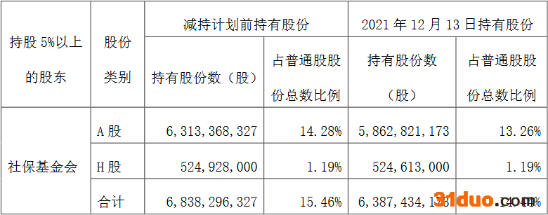 社保基金会前次减持计划于2021年1月30日实施完毕。自2021年2月1日至2021年12月13日,社保基金会除上述减持中国人保A股4.51亿股之外,通过境外管理人间接持有的中国人保H股累计减少31.50万股,即A股和H股持股数量合计减少4.51亿股,占中国人保已发行普通股股份总数的1.02%。