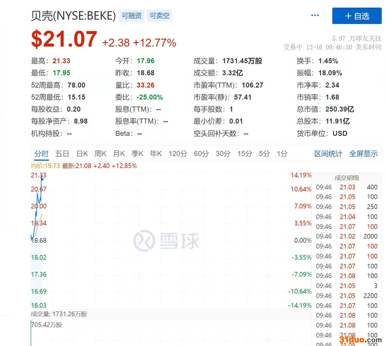 当日,贝壳股价一度前盘下跌超过10%。截至记者发稿时,贝壳股价反弹上涨12.77%。