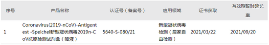 而值得注意的是,德国联邦药品和医疗器械研究所(Bfarm)对于oronavirus(2019-nCoV)-Antigentest - Speichel 新型冠状病毒2019n-CoV抗原检测试剂盒(唾液)的特殊批准有效期从2021年6月20日延期至2021年9月20日已结束,对于Coronavirus(2019-nCoV)-Antigentest – 新型冠状病毒2019n-CoV抗原检测试剂盒(前鼻腔)的特殊批准有效期从6月2日延期至9月2日,目前也已结束。其销售业绩可否持续爆发有待商榷。