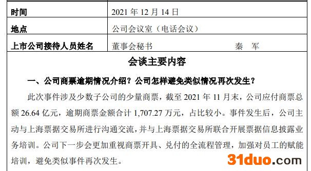 谈及近期的商票逾期情况,牧原股份表示,此次事件涉及少数子公司的少量商票,截至 2021年11月末,公司应付商票总额26.64亿元,逾期商票金额合计1707.27万元,占比较小。事件发生后,公司主动与上海票据交易所进行沟通交流,并与上海票据交易所联合开展票据信息披露业务培训。公司下一步会更加重视商票开具、兑付的全流程管理,加强对员工的赋能培训,避免类似事件再次发生。