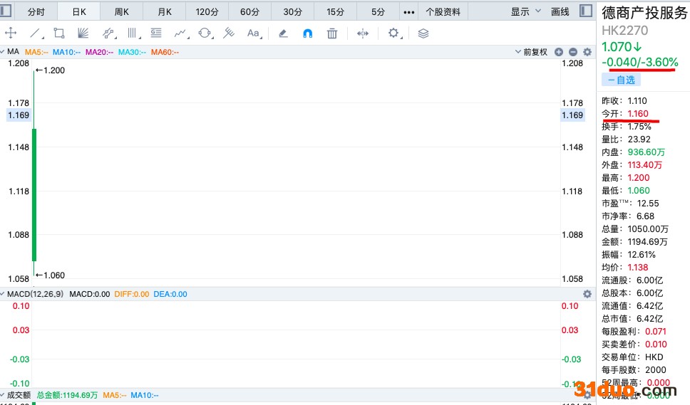 中华网财经12月17日讯:德商产投服务集团有限公司(简称:德商产投服务,2270.HK)今日在香港联交所挂牌上市,上市首日高开4.5%,报1.16港元。截至发稿,每股报价1.07港元跌幅3.60%,总市值6.42亿港元。今日盘中最低每股1.058港元,跌幅一度达8.79%。