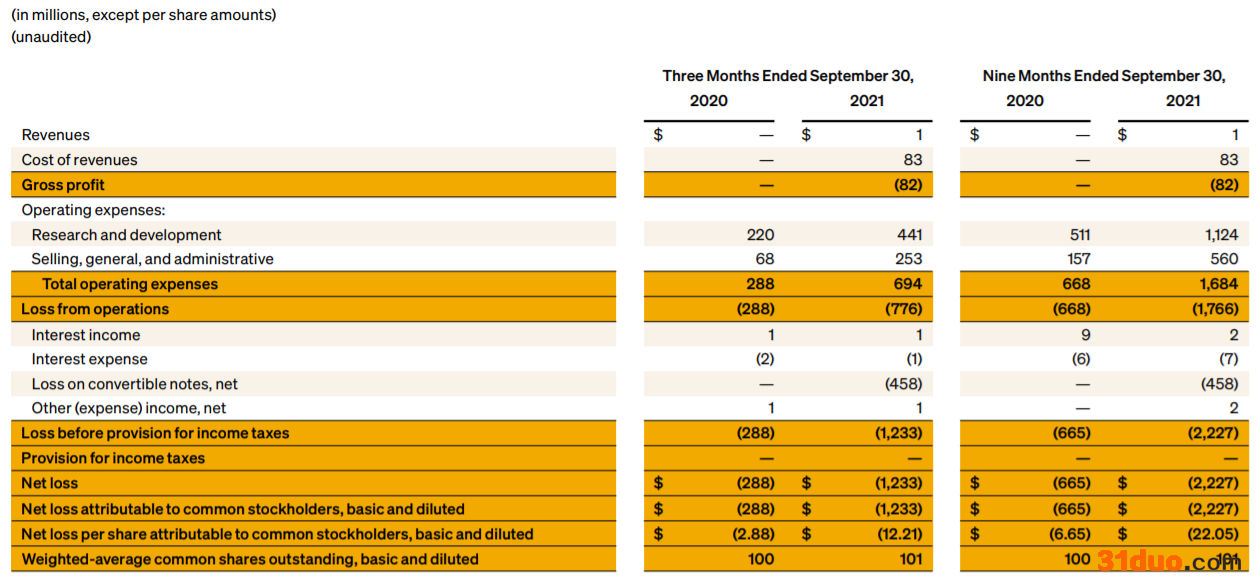 根据财报披露,公司今年三季度总共实现营收100万美元,营运损失7.76亿美元,净亏损12.33亿美元,去年同期亏损2.88亿美元。由于公司此前已经给出过亏损12.1-12.8亿美元的前瞻指引,所以周四的数据虽然谈不上好看,但也难言意外。不过在成长股承压的背景下,截至发稿公司盘后继续下跌3.05%。