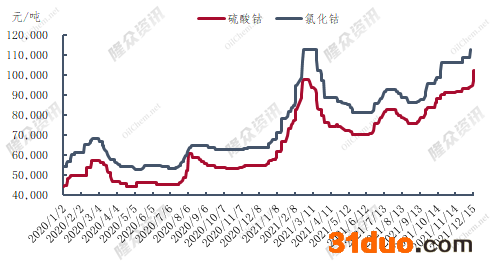 钴盐一般指硫酸钴、氯化钴、碳酸钴、硝酸钴等产品,主要用于电池材料、高温合金和硬质合金等。受停产消息刺激,隆众资讯数据显示,12月16日硫酸钴均价为102500元/吨,创年内新高,较疫情停产前一天(12月9日)上涨8.47%,氯化钴等产品亦强势上涨。