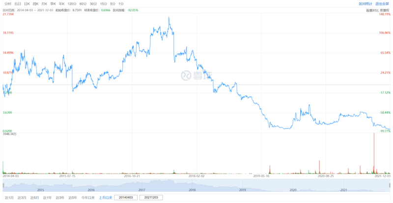 截至12月3日收盘,达内报0.6966美元/股,较最高峰值2017年7月20日的20.15美元/股下降了96.54%。