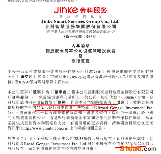 公告中,金科服务指出,近日控股股东金科股份引入博裕投资作为金科智慧服务集团股份有限公司战略投资者,并向博裕投资旗下投资主体BROADGonGGA INVESTMENT PTE. LTD.转让所持金科服务1.44亿股H股全流通股份(约占金科服务总股本的22%)。股份转让交易金额为37.34亿港元,即每股转让价格为26.00港元。交易完成后,公司仍持有金科服务 30.33%的股份,金科地产仍为金科服务的第一大股东及控股股东。