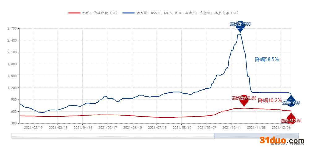 一般而言,煤炭成本占到水泥生产总成本的一半左右,而今年的高煤价更是提高了这一比例,某南方水泥行业上市公司告诉记者,目前煤炭成本接近水泥生产成本的60%。今年10月中下旬以来,国内动力煤均价持续走低,至今跌幅已近60%,而水泥价格跌幅则只有10%左右。