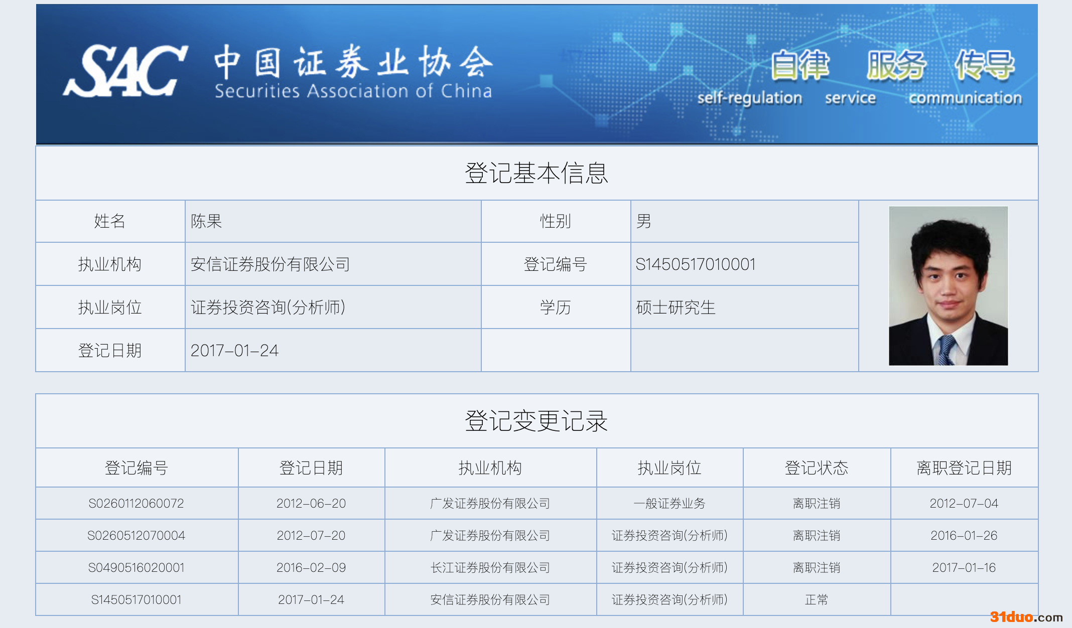 根据公开资料,陈果毕业于复旦大学和上海交通大学,曾任职于申银万国证券研究所、广发证券研究所及长江证券,获得2014年新财富策略第七名、2015年新财富策略第六名、2020年新财富策略第五名,2017年加盟安信证券。