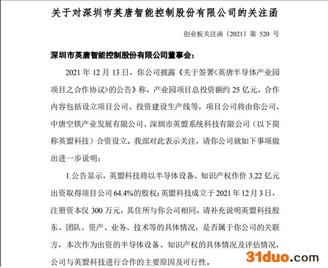 据深交所12月17日披露的《关于对深圳市英唐智能控制股份有限公司的关注函》创业板关注函〔2021〕第 520 号,2021 年 12 月 13 日,深圳市英唐智能控制股份有限公司披露《关于签署 英唐半导体产业园项目之合作协议 的公告》称,产业园项目总投资额约 25 亿元,合作内容包括设立项目公司、投资建设生产线等,项目公司将由你公司、中唐空铁产业发展有限公司、深圳市英盟系统科技有限公司(以下简称英盟科技)合资设立。