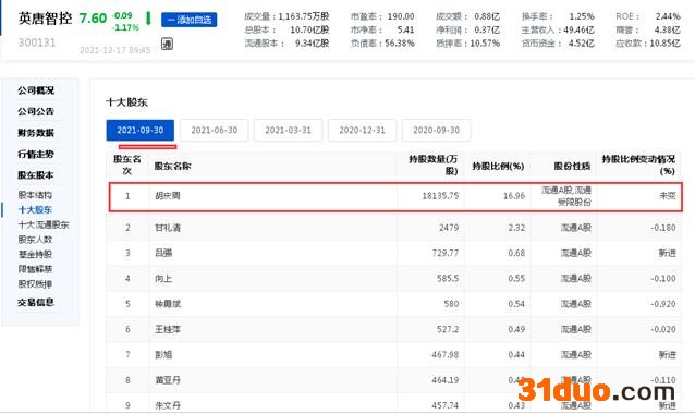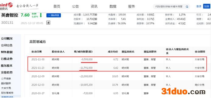 其中,针对第九大问题,笔者注意到,英唐智控董事长、第一大股东胡庆周在上个月即11月期间,先后两次通过大宗交易的方式,累计减持了2139万股,累计套现约1.40亿元。