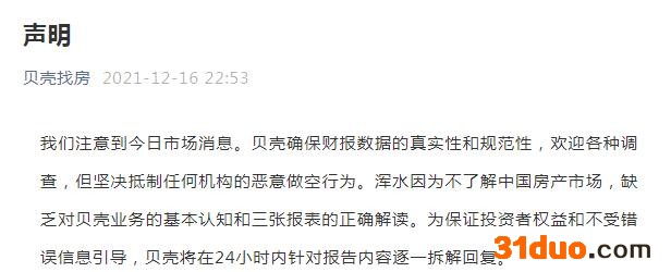 中新经纬12月16日电 16日晚,贝壳找房发布声明称,注意到今日市场消息,公司确保财报数据的真实性和规范性,欢迎各种调查,但坚决抵制任何机构的恶意做空行为。