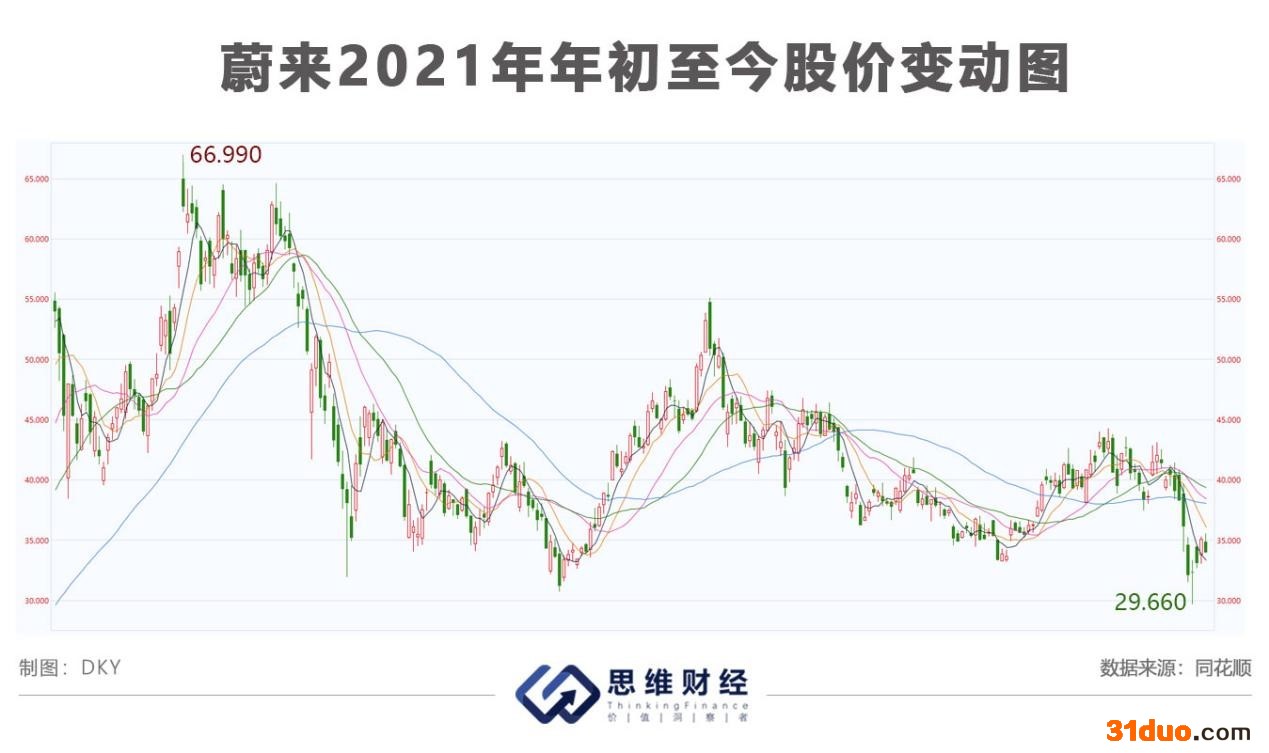 蔚来汽车的股价表现起伏犹如过山车,2021年12月15日收于30.79美元/股,较今年1月高点67美元/股已经腰斩。