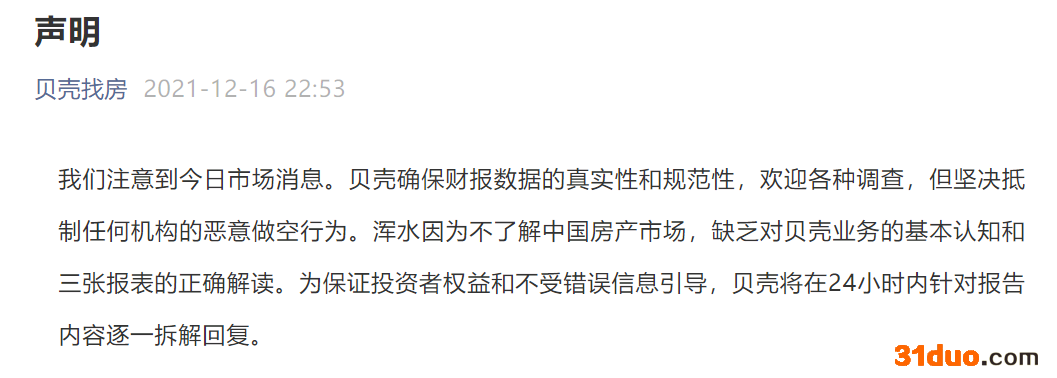随即,贝壳找房回应表示,“我们注意到今日市场消息。贝壳确保财报数据的真实性和规范性,欢迎各种调查,但坚决抵制任何机构的恶意做空行为。浑水因为不了解中国房产市场,缺乏对贝壳业务的基本认知和三张报表的正确解读。为保证投资者权益和不受错误信息引导,贝壳将在24小时内针对报告内容逐一拆解回复。