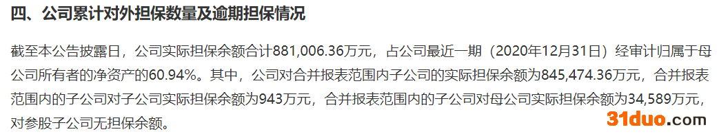 截至公告日,公司担保余额高达88亿元,占公司最近一期经审计的净资产的61%。