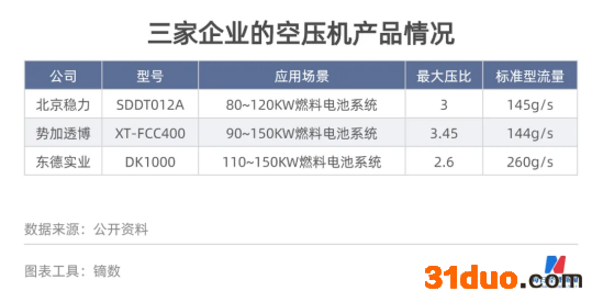 不过,同上述三家企业的空压机产品相比,北京稳力的产品在这两个指标上并无压倒性优势。具体而言,北京稳力空压机(型号SDDT012A)的应用场景为80~120KW燃料电池系统,最大压比是3.0,最大流量是145g/s。势加透博空压机(型号XT-FCC400)的应用场景为90~150KW燃料电池系统,最大压比为3.45,标准型流量为144g/s。东德实业空压机(型号DK1000)的应用场景为110~150KW燃料电池系统,在压比为2.6的条件下,出口流量最大可达到260g/s。