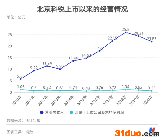 上市十多年,北京科锐的核心业务一直都是配电设备制造。然而,“聚焦主业”并未给北京科锐带来持续的高增长。2010年至2019年,其归属于上市公司股东的净利润的年均增长率仅为1.64%,最高峰时也只有1.04亿元。盘子小、步子慢,碰到增长“天花板”的北京科锐开始找出路。