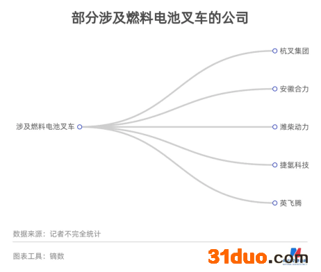 叉车系统同样有不少企业正在布局。《每日经济新闻》记者粗略统计,杭叉集团、安徽合力等整车企业,以及潍柴动力、捷氢科技、英飞腾等燃料电池企业都涉及燃料电池叉车业务。
