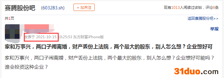 需要注意的是,这一离婚事件并非没有征兆可寻。今年10月时,就有投资者在赛腾股份股吧中发帖称:“两口子闹离婚”。