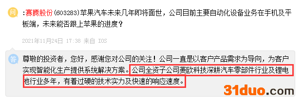 在上证e互动中,针对投资者有关苹果汽车的问题,赛腾股份就表示,公司全资子公司菱欧科技深耕汽车零部件行业及锂电池行业多年,有着过硬的技术实力及快速的响应速度。